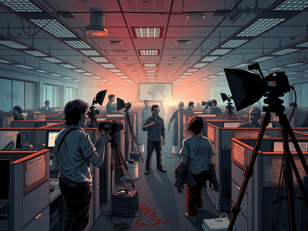 The video opened with an older woman in scrubs (because, health insurance). She arrives at the call center at dusk, enters the building, and encounters a creepy guy—yours truly. I silently lead her down a dimly lit hallway, up a staircase, and through a door. She turns to ask where she’s supposed to go, but I’ve vanished. The door slams behind her. She screams.
